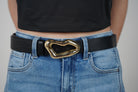 A bold black belt elevated by a unique, abstract gold buckle that redefines everyday styling