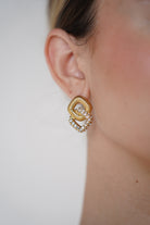 Elevate your accessories with the Rena Square Earrings. This glamorous pair showcases a double square design—one gold textured link intertwined with a second shimmering crystal-studded square. The contrast creates a chic, sculptural effect that brings elegance to both day and night looks. Lightweight yet eye-catching, they’re the perfect finishing touch to elevate even your simplest outfit.