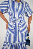 Effortlessly stylish, this blue-and-white striped maxi dress features a belted waist, oversized front pockets, and an easy, breezy silhouette.