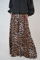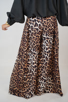 Model wearing Romi Leopard Palazzo Pants – high-waist, wide-leg trousers with bold animal print