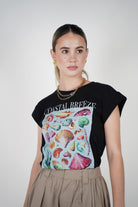 Model wearing the Rovi Ocean Graphic Tee featuring colorful seashell print and rolled sleeves on a black cotton base.