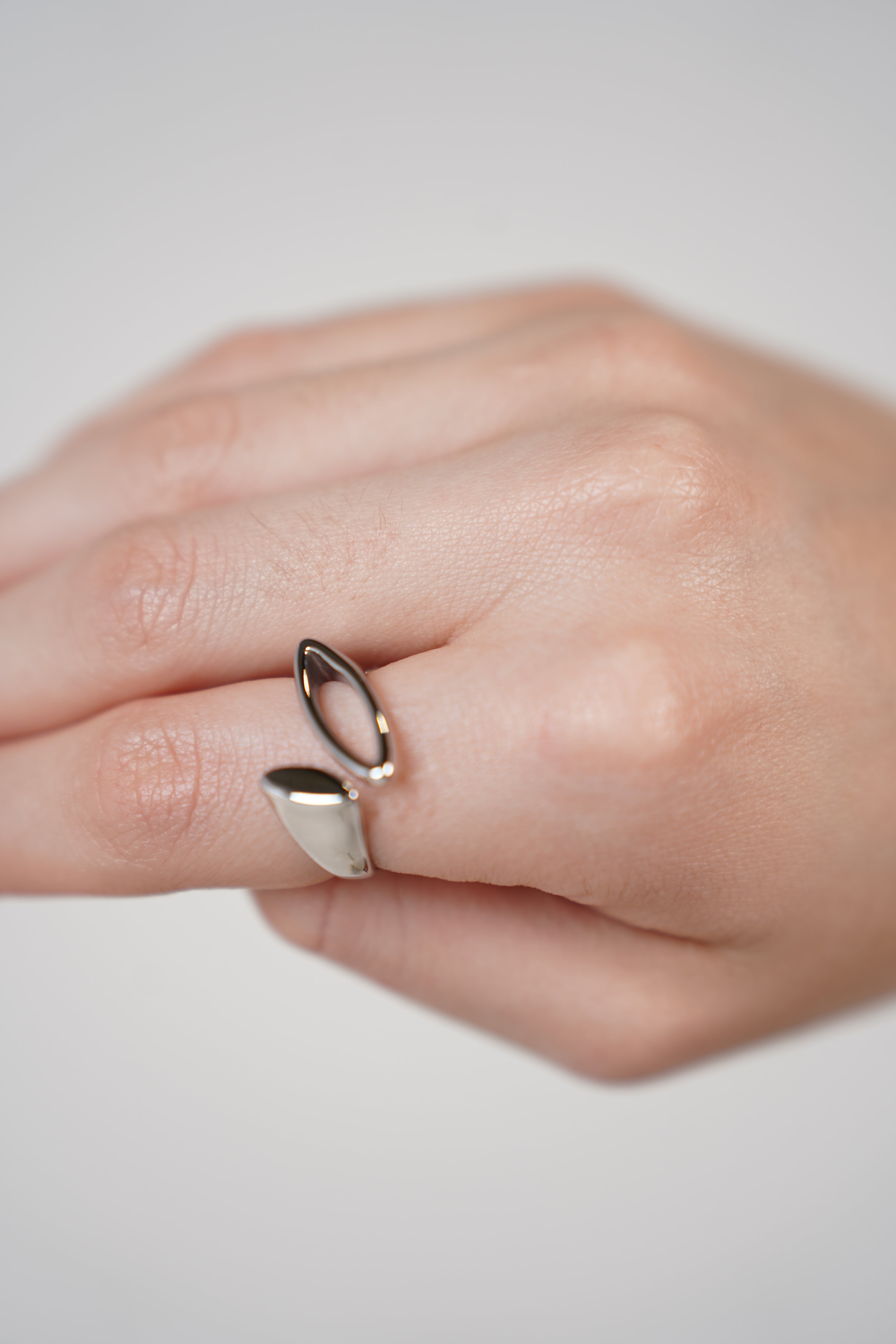 Silver-tone open ring with one solid end and one hollow marquise-shaped end on model’s hand.