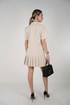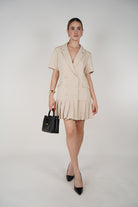 Model wearing a beige short-sleeve blazer-style mini dress with pleated hem and double-breasted buttons