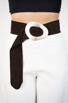 Model is showcasing the Seralya Suede Belt in studio lighting to highlight its suede texture, sculpted buckle, and deep color.