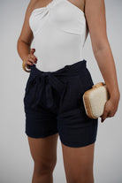 Close-up of model wearing high-waisted tie-front linen shorts in a soft grey tone, styled with a white one-shoulder top.