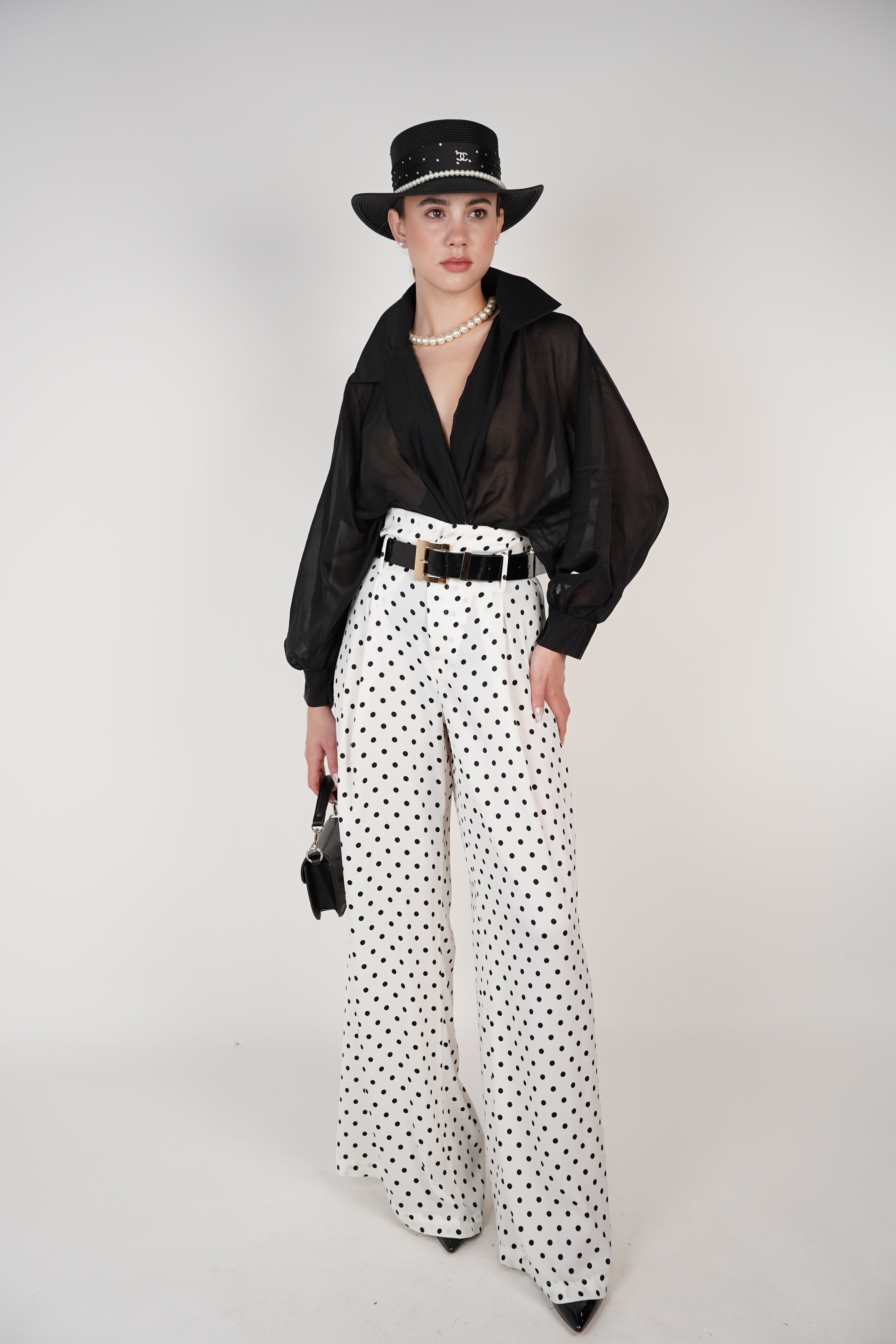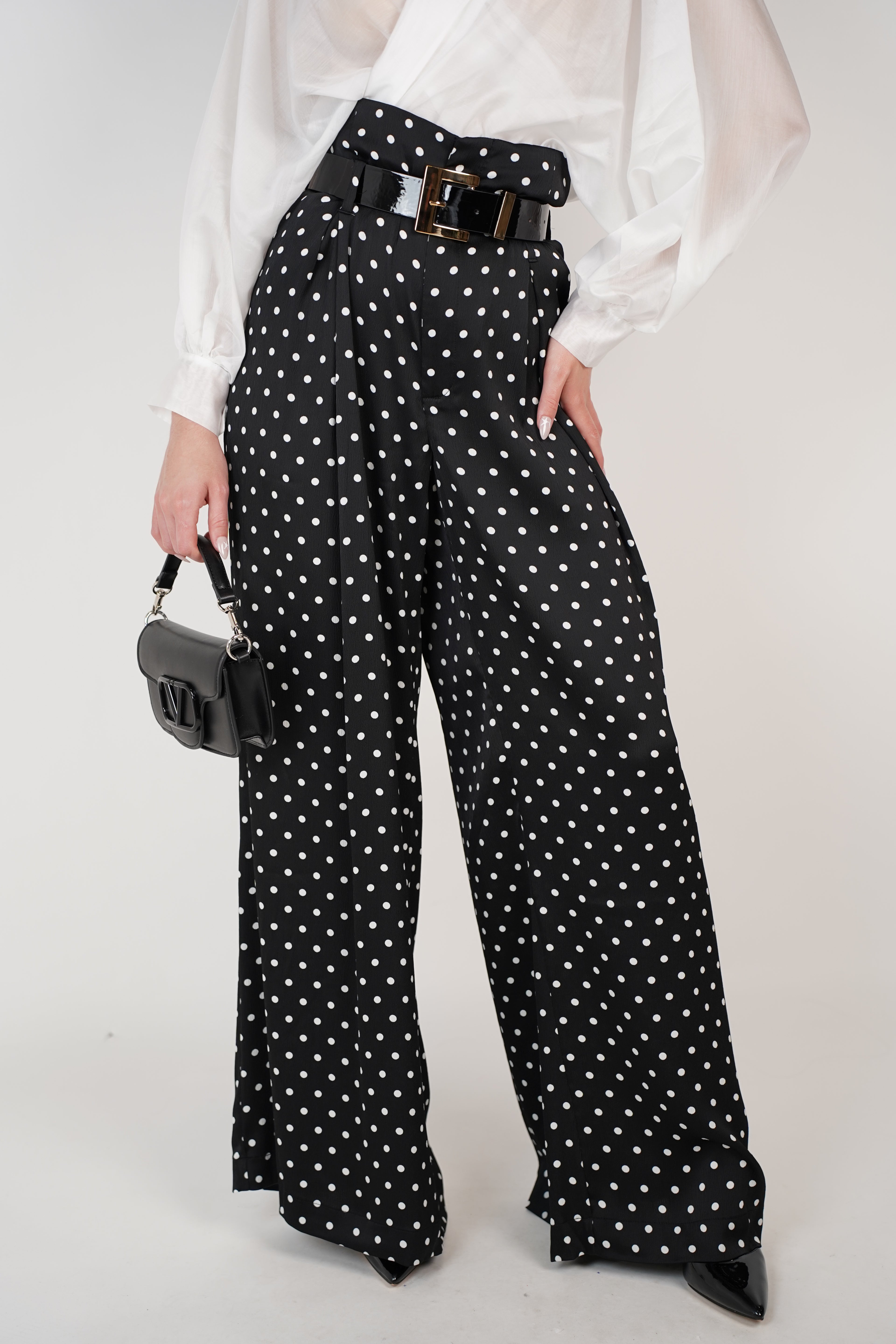 High-waisted wide-leg pants with a playful polka dot print and timeless black-and-white contrast.