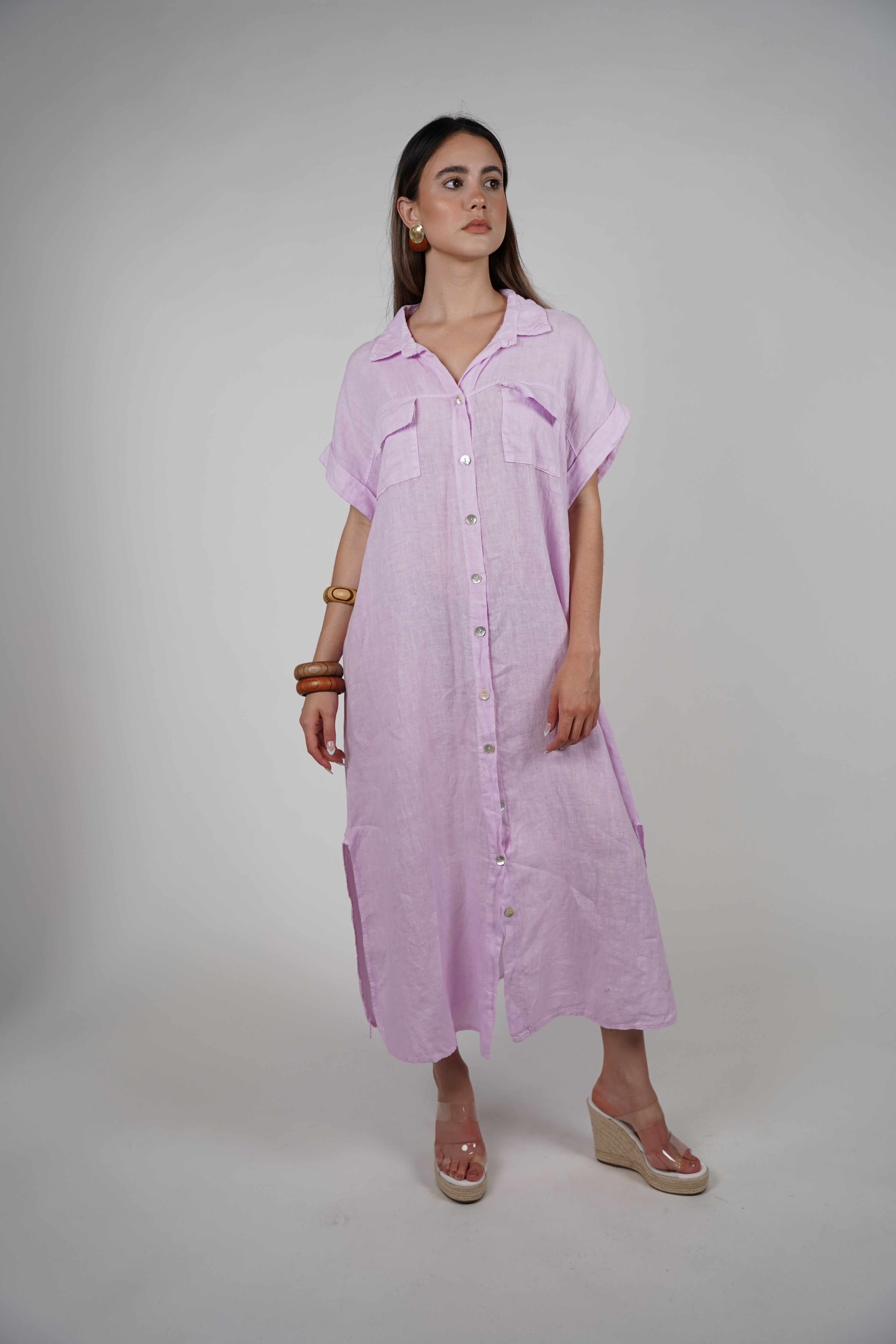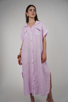A lightweight, breathable button-down linen maxi dress with front pockets and a relaxed fit. Easy to dress up or down.