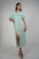 Model wearing a mint green linen button-down maxi dress with short sleeves and a front slit, styled with platform sandals and bangles.