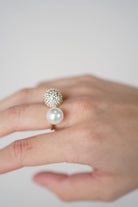 Close-up of Tanel Pearl Ring – pavé crystal sphere and pearl statement ring on hand