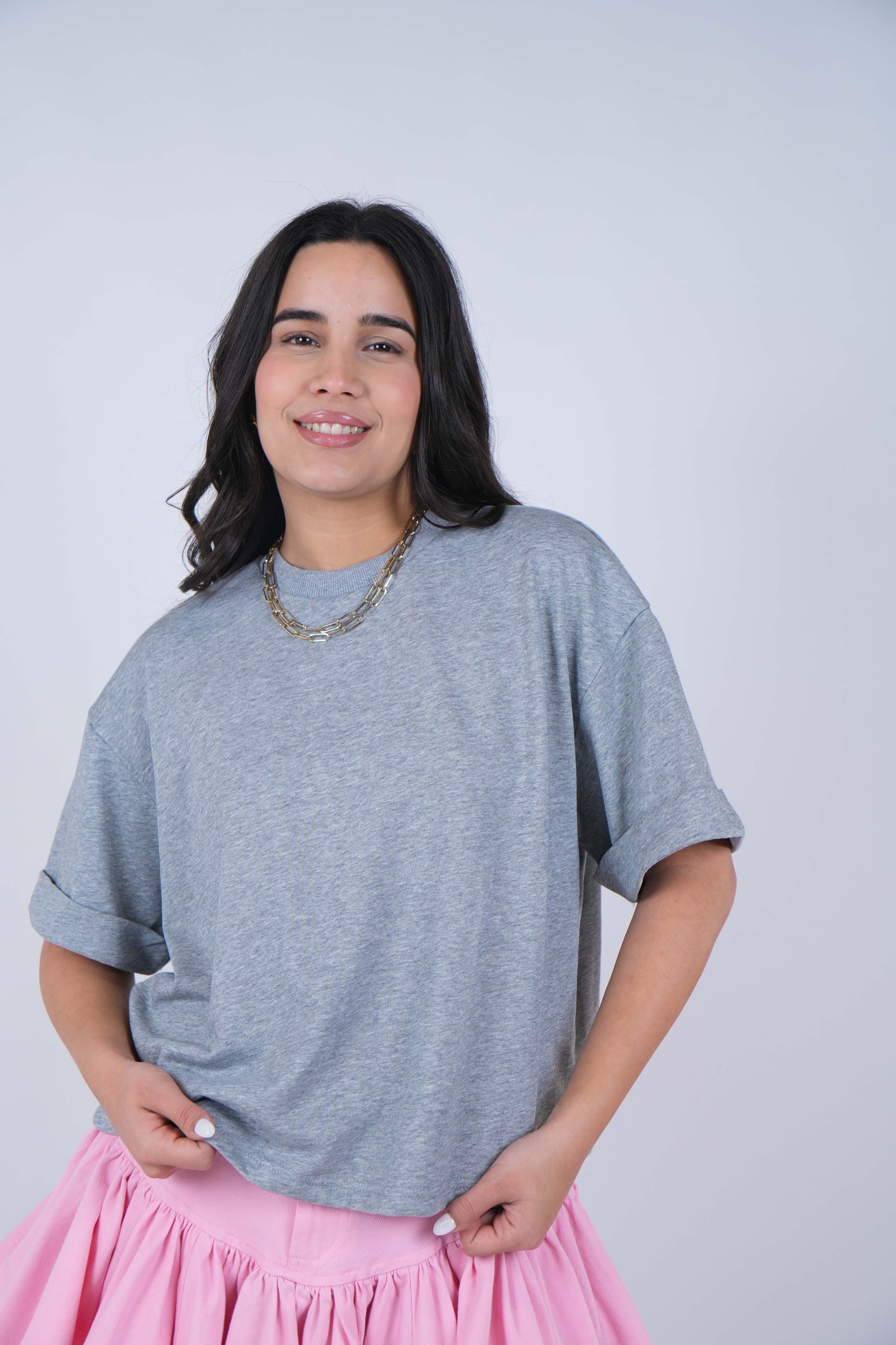 Relaxed short sleeve knit top in heather gray with rolled cuffs worn on a model against a neutral background.