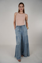 The Thani Wideleg Denim Pants combine soft denim with a breezy silhouette, giving you the ultimate laid-back yet stylish look. Designed with gathered tier details and a flowy fit, these pants flatter every shape. The elastic drawstring waist ensures comfort and adjustability, making them perfect for everyday wear, travel, or weekend strolls. Pair them with a bodysuit or a crop top for an effortlessly chic vibe.