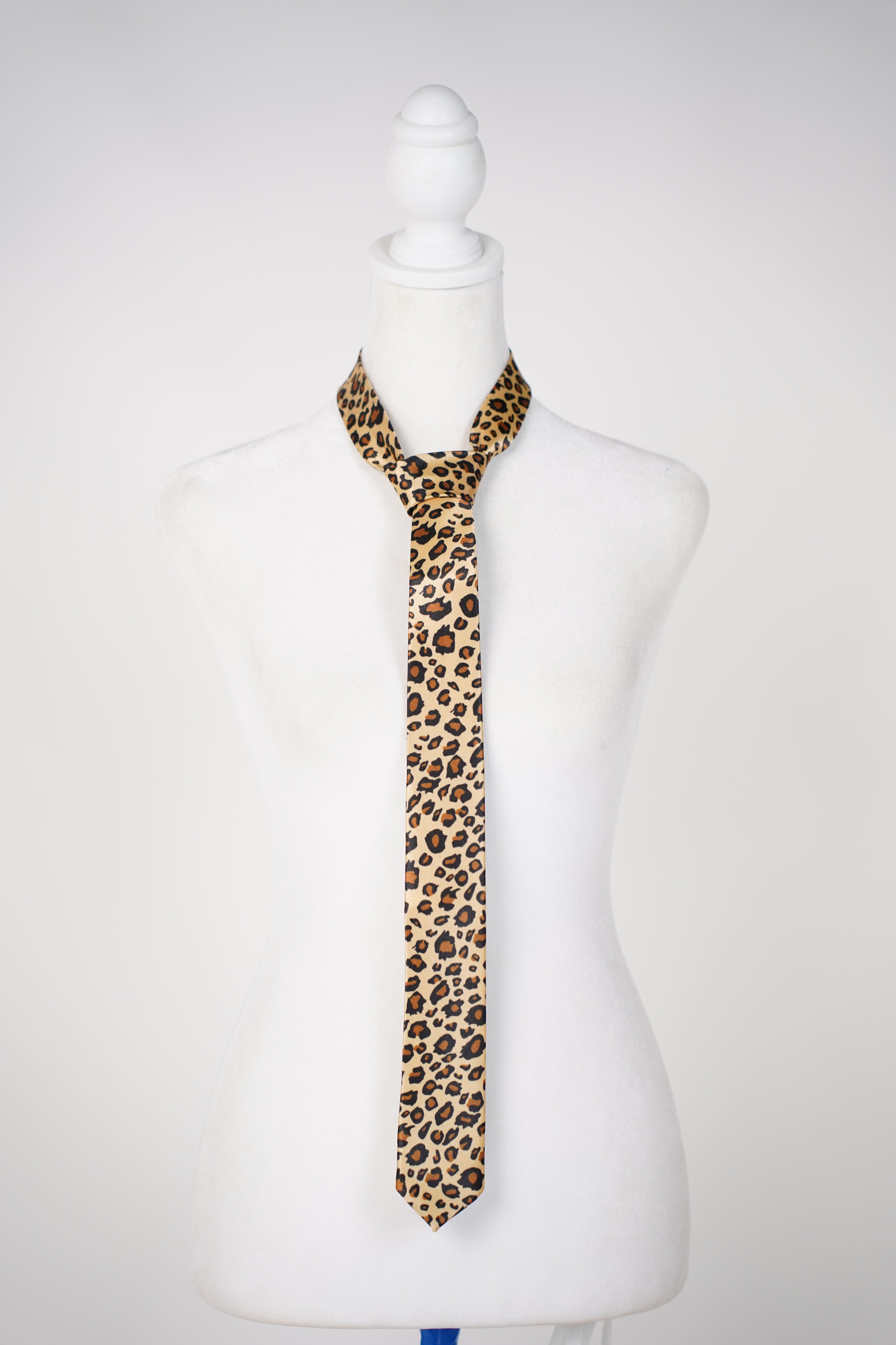 “Thin satin leopard-print necktie displayed on mannequin.”