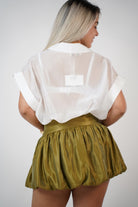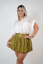 Model is 5'7", wears the Tiven Mini Bubble Skirt paired with the Jeyra Flaca Top. Skirt has a voluminous shape and structured waistband.