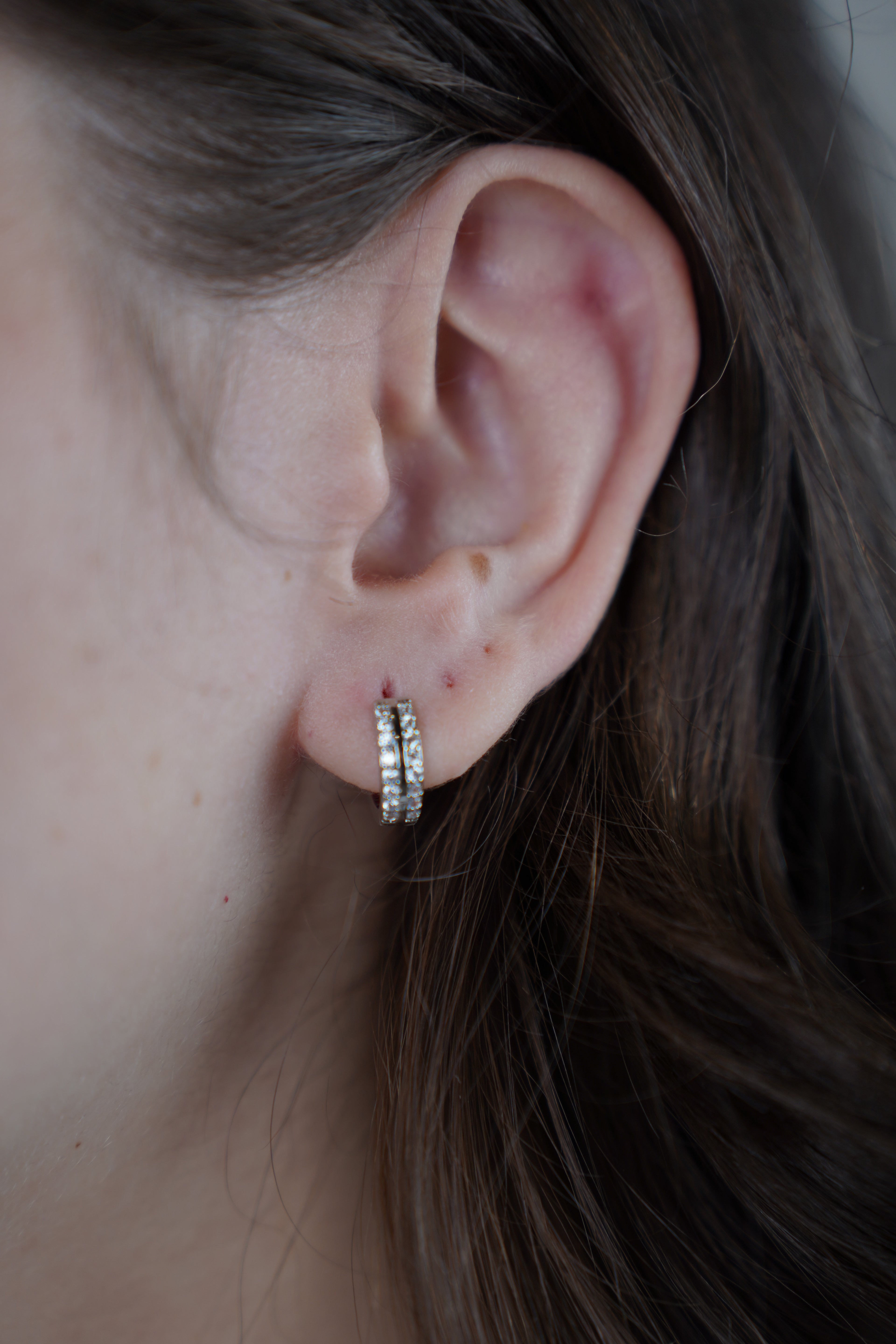 Close-up of Tora Mini Hoop earring with dual crystal row, worn on ear.
