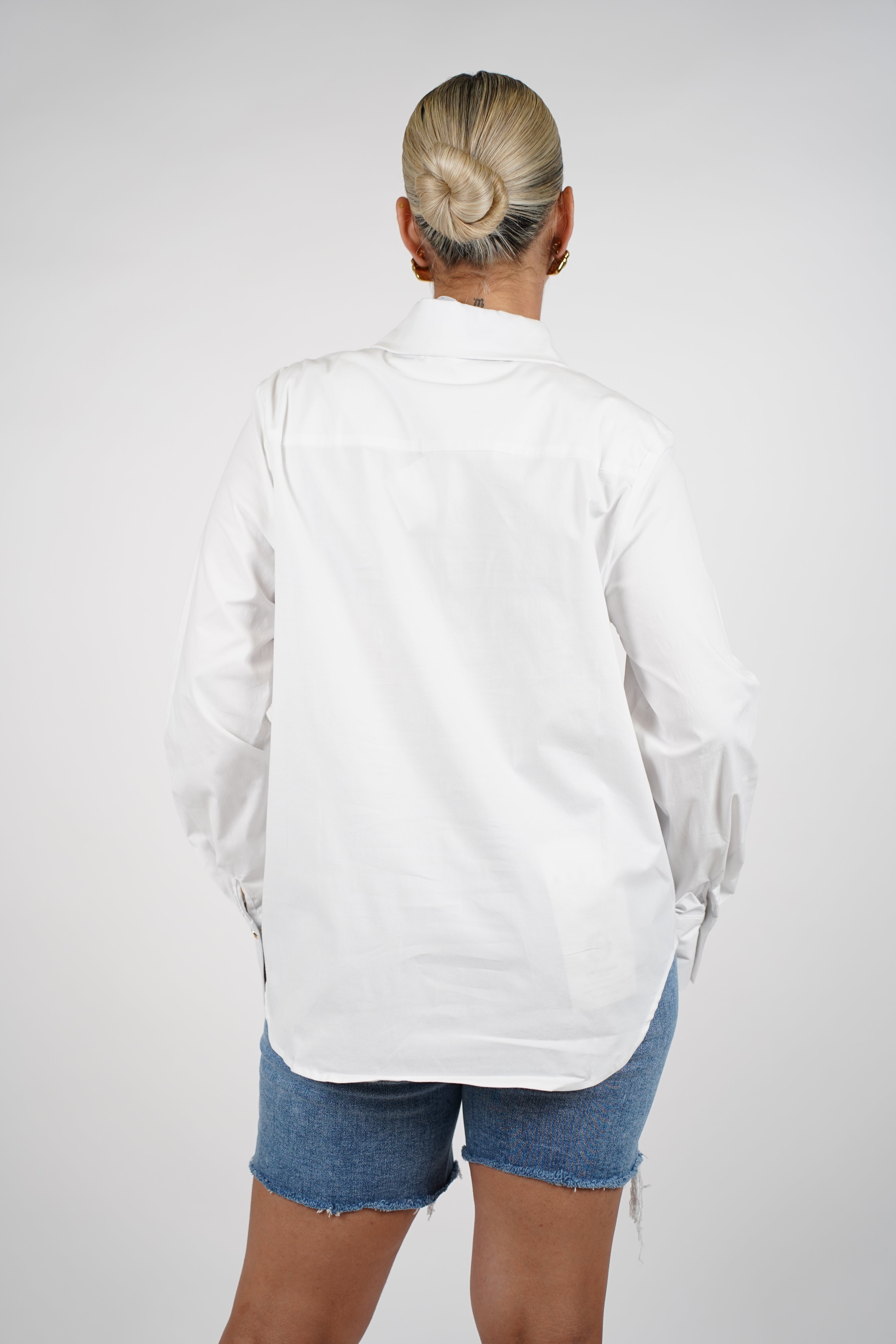 Meta Description: Shop the Tova Button Down, a crisp white shirt with elegant gold-ring buttons. Perfect for layering, styling, or dressing up any look.