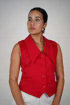 The Vale Vest features a structured fit with sharp lapels and bold front buttons for a clean, polished look. Designed with a flattering V-hem and available in classic cream and bold red, this piece can be worn on its own or layered over your favorite tops. It's perfect for work-to-weekend styling.