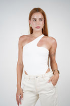 Shop the Varo Asymmetrical Basic Bodysuit at Carema Boutique. Black one-shoulder bodysuit with unique cutout detail and sleek fit. Perfect for chic minimalist styling.
