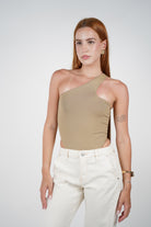 Black one-shoulder asymmetrical bodysuit with cutout detail, worn by a woman with olive drawstring pants.
