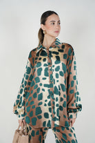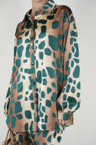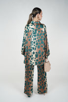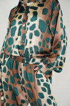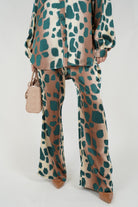 A coordinated pants set featuring a relaxed button-down top and wide-leg pants with an abstract leopard-inspired stamp for a bold yet polished look.