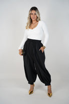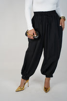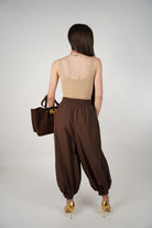 Shop the Veria Aladdin Joggers — flowy balloon-style pants with elastic waist and cuffed ankles. Available in black and brown.