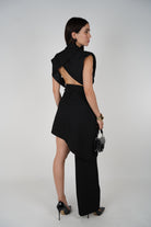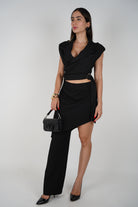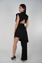 Model wearing the black Vexa Skirt Set featuring a cropped sleeveless blazer and asymmetrical skirt with one pant leg.