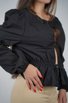 The Victoria Top brings a touch of elegance and edge to your wardrobe. This black long sleeve blouse features delicate front tie closures, puffed sleeves, and a cinched elastic waist that highlights your shape effortlessly. With its lightweight feel and polished look, it's perfect for a day at the office or a night out. Pair it with high-waisted trousers or denim for a sleek, confident vibe.