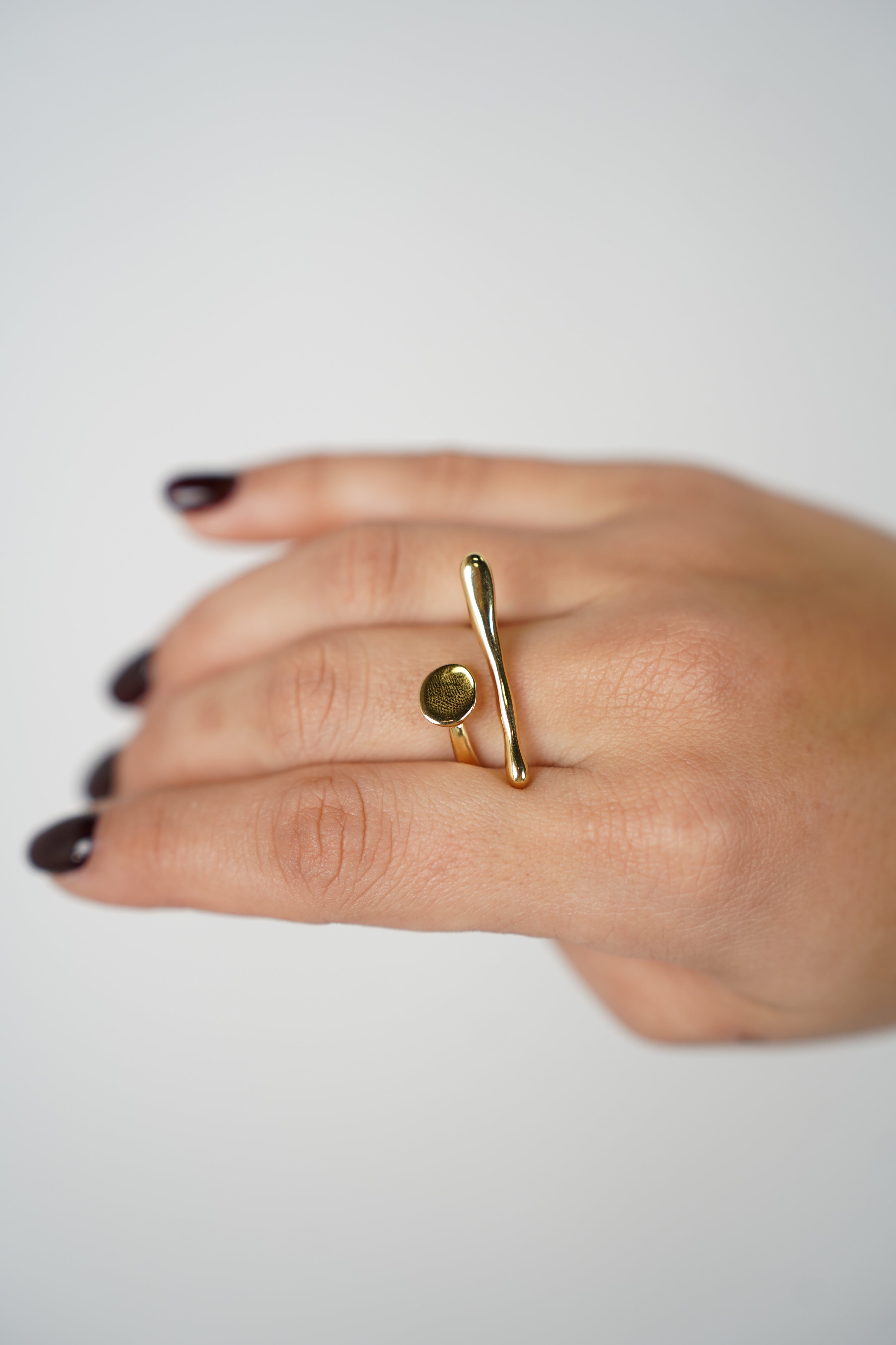Shop the Viera Ring, a modern asymmetrical gold open ring with minimalist sculptural design. Adjustable, lightweight, and perfect for stacking.