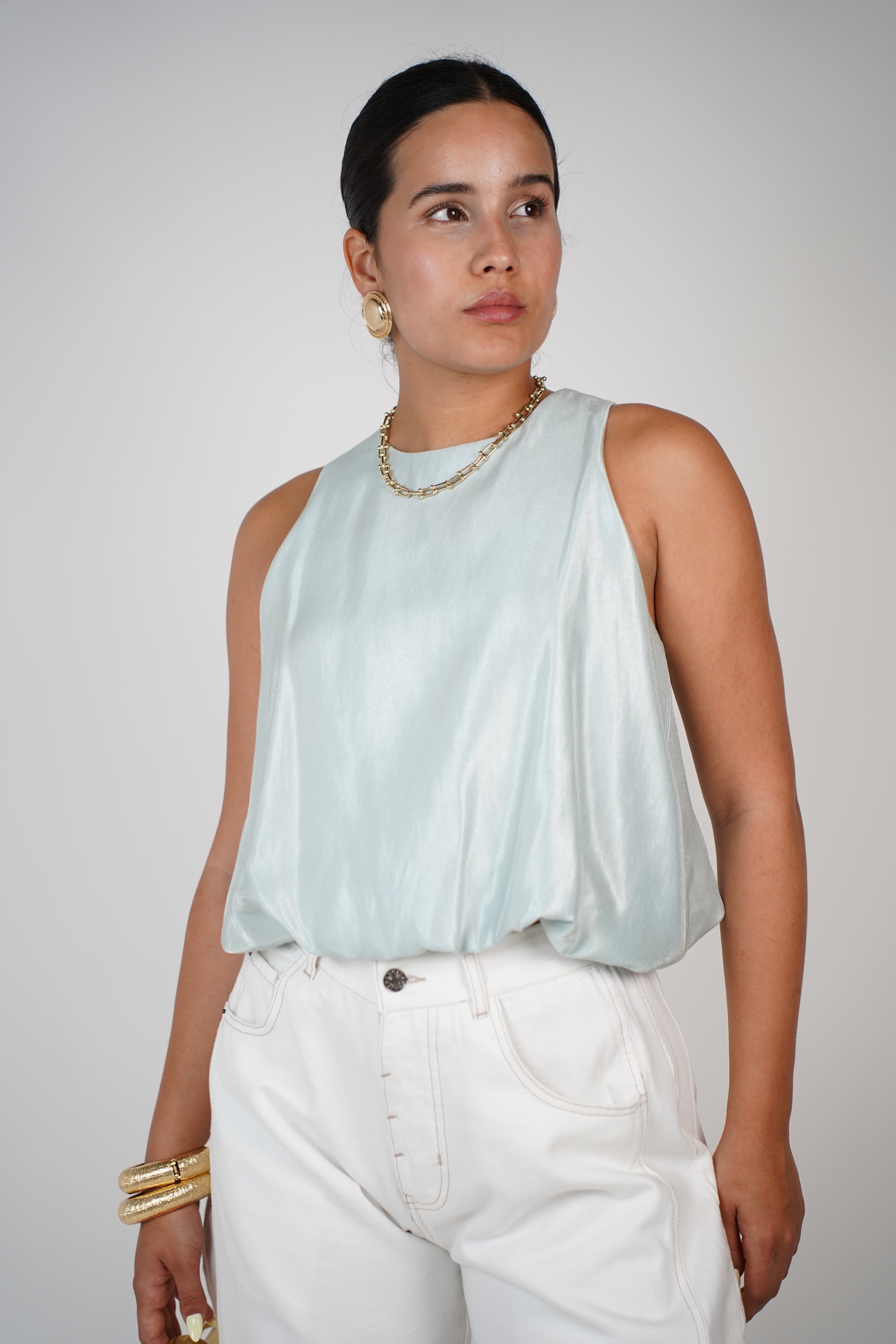 A luxurious satin sleeveless blouse featuring a classic round neckline and a relaxed fit. Perfect for day-to-night elegance. Available in ivory and aqua.