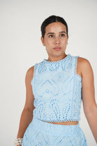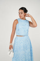 • Meta Description: Shop the Virelle Crochet Skirt Set featuring a sleeveless crop top and high-waisted A-line skirt in light blue eyelet embroidery. Perfect for summer styling.