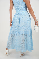 A breezy, romantic look in a soft pastel blue. The Virelle Crochet Skirt Set is crafted from airy, embroidered eyelet fabric with intricate patterns for a feminine, elegant vibe. The set includes a sleeveless, boxy-cut crop top with delicate scalloped edges and a matching high-waisted A-line skirt that falls gracefully to the ankles. Perfect for brunch dates, summer parties, or seaside strolls.