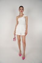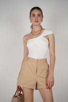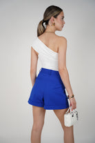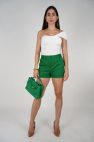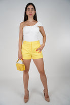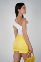 Bright yellow tailored shorts with cuffed hem, styled with a white one-shoulder top and yellow mini handbag.