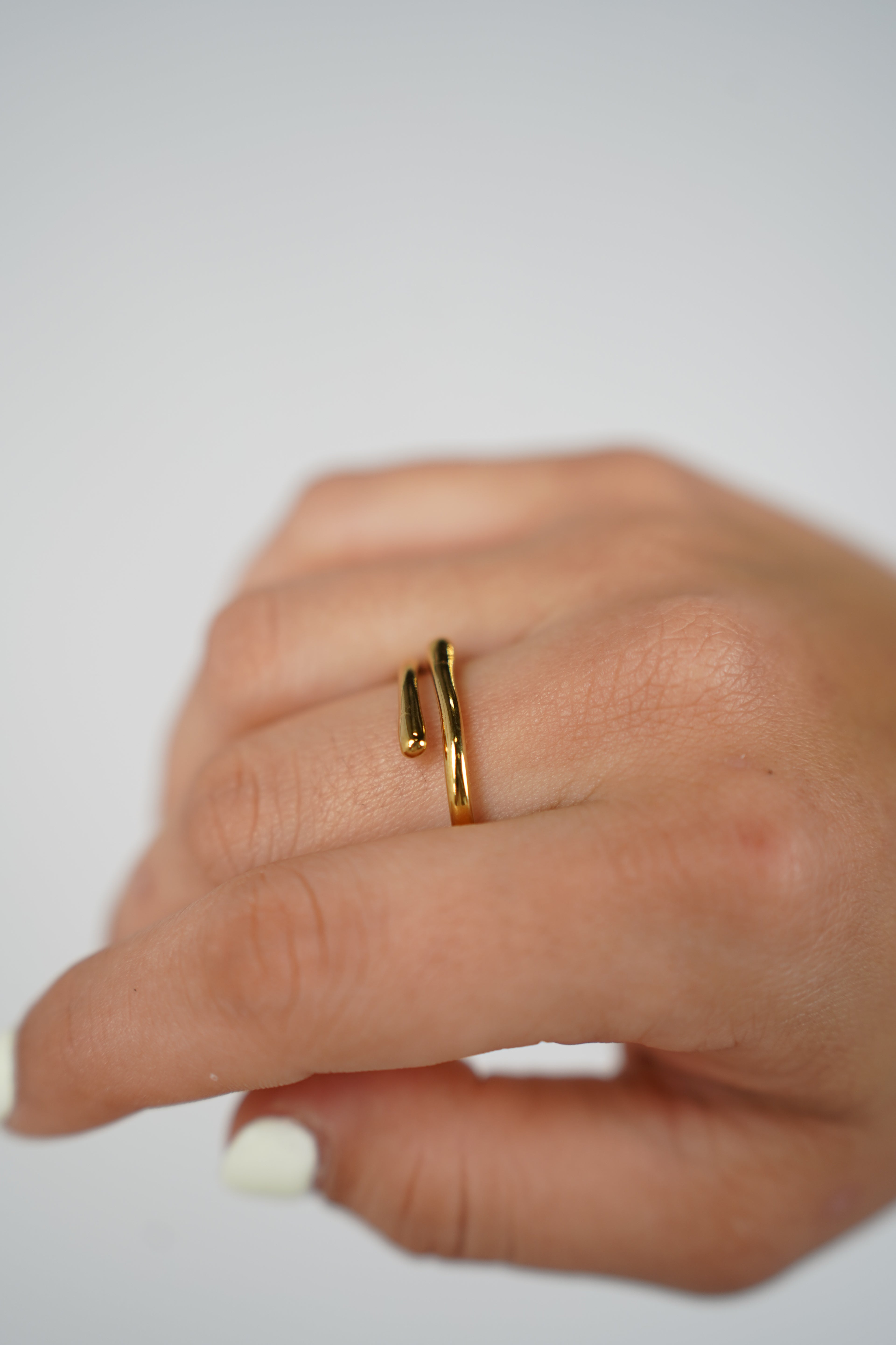 Close-up of a hand wearing a slim open-ended gold ring with a minimalist design.