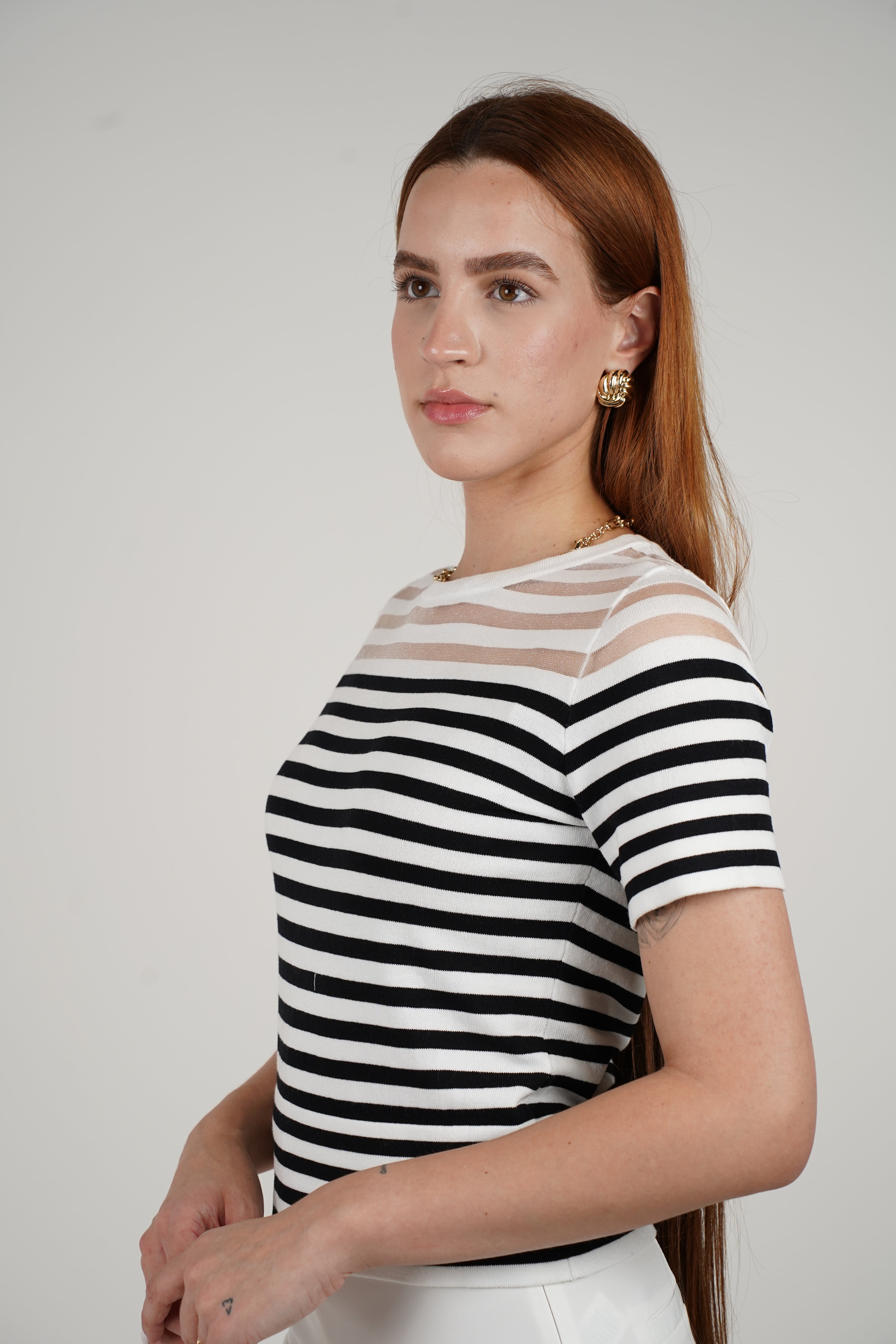 Meta Description: The Viviana T-Shirt is a striped knit with sheer panels, perfect for casual days or layered looks. Available in black/white or yellow/white. Shop now.