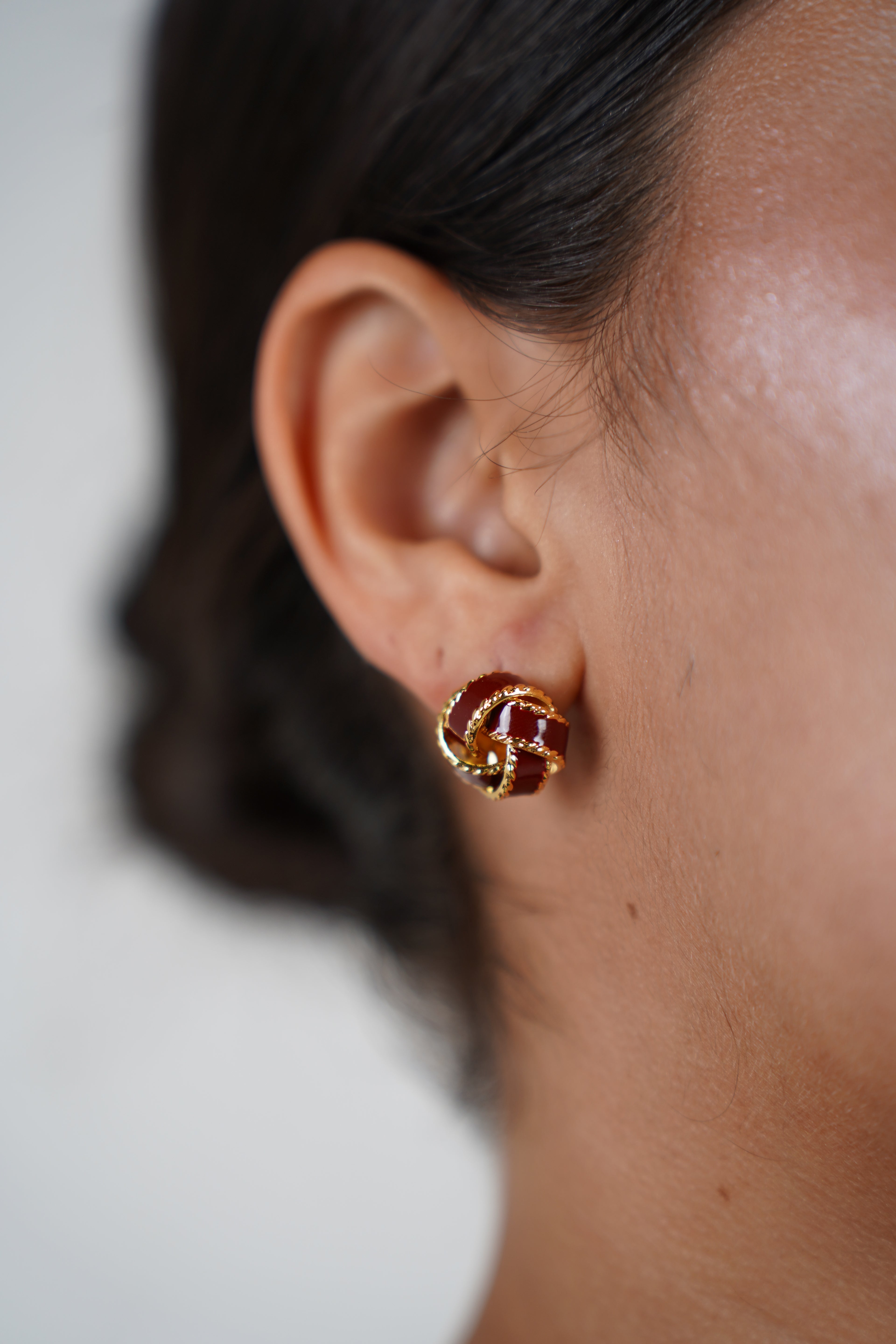 Elegant knot-style stud earrings in deep red enamel with gold trim for a vintage-inspired finish.