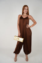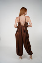 A flowy satin jumpsuit with a loose harem-style silhouette and gathered ankle cuffs. Chic, comfortable, and available in multiple colors.