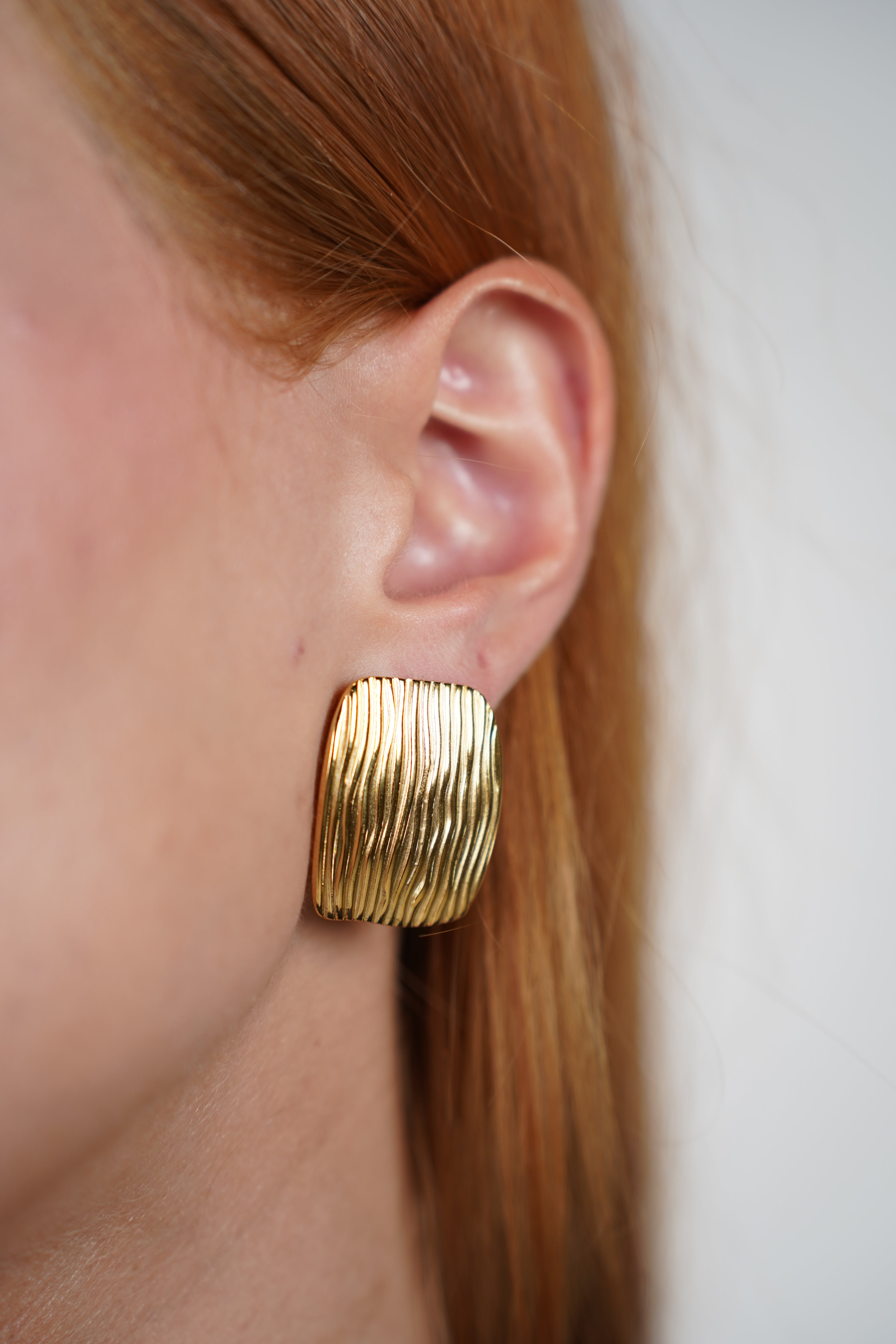 Close-up of square gold-tone textured earrings on model with red hair, showcasing the bold ribbed surface.
