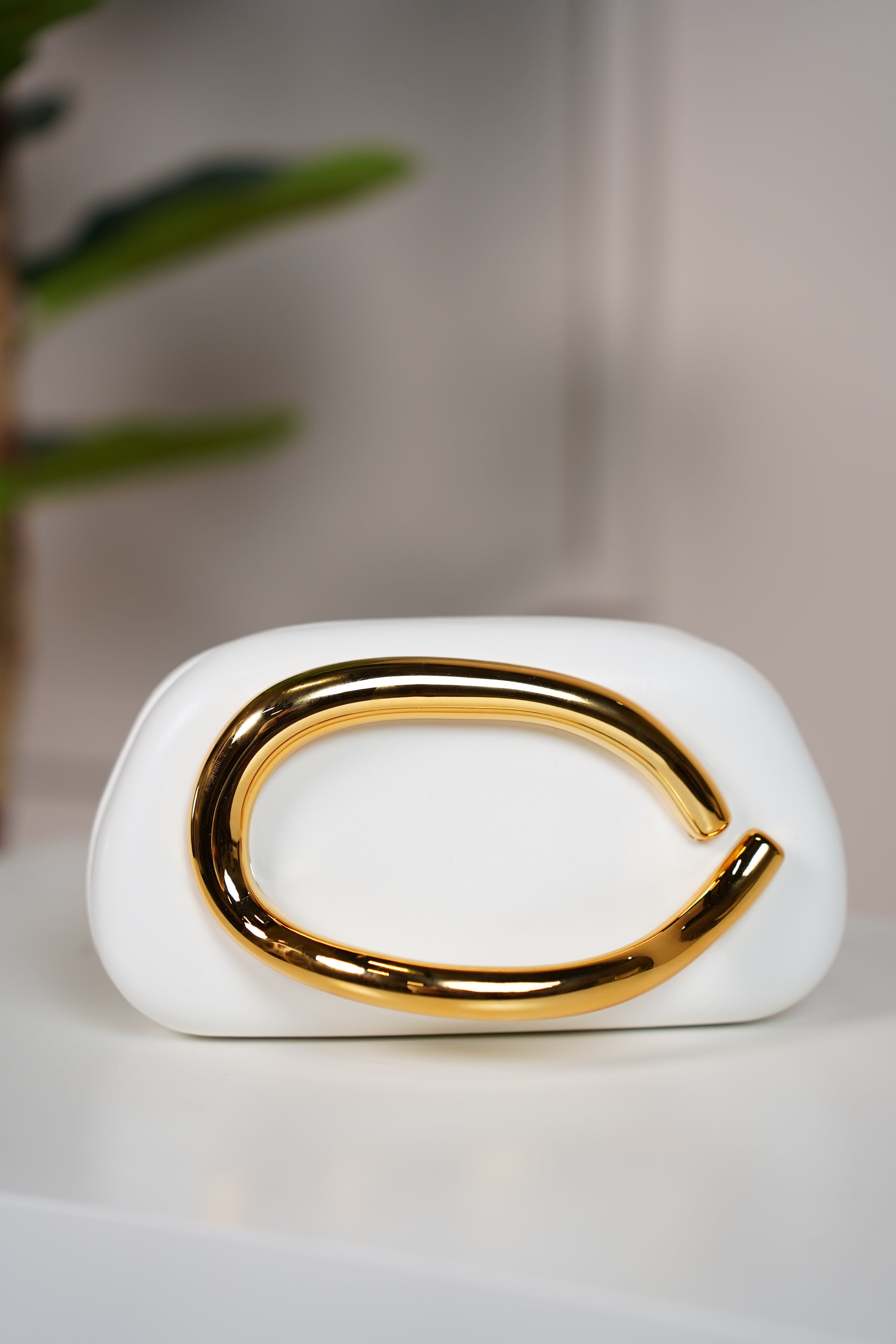A modern white clutch featuring a curved gold statement detail for standout minimalism.