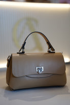 Taupe structured handbag with silver hardware, top handle, and clasp closure displayed on a light surface.