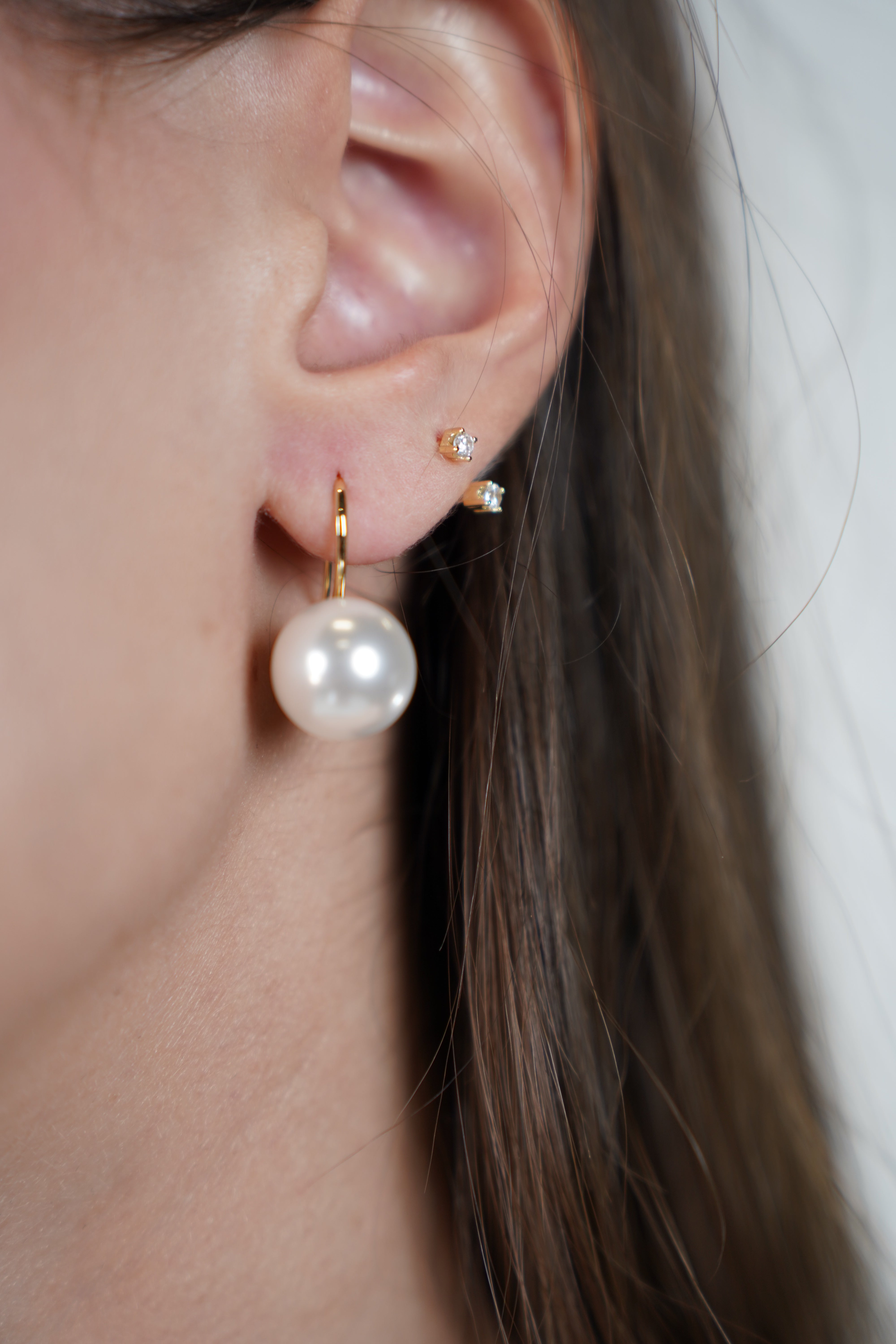 Model is wearing one Zeli Pearl Earring on the lobe with small studs layered above
