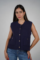 Meta Description: The Zhoe Sweater Vest features a navy knit body, gold buttons, and front pockets. A timeless layering piece for a polished, elevated style.