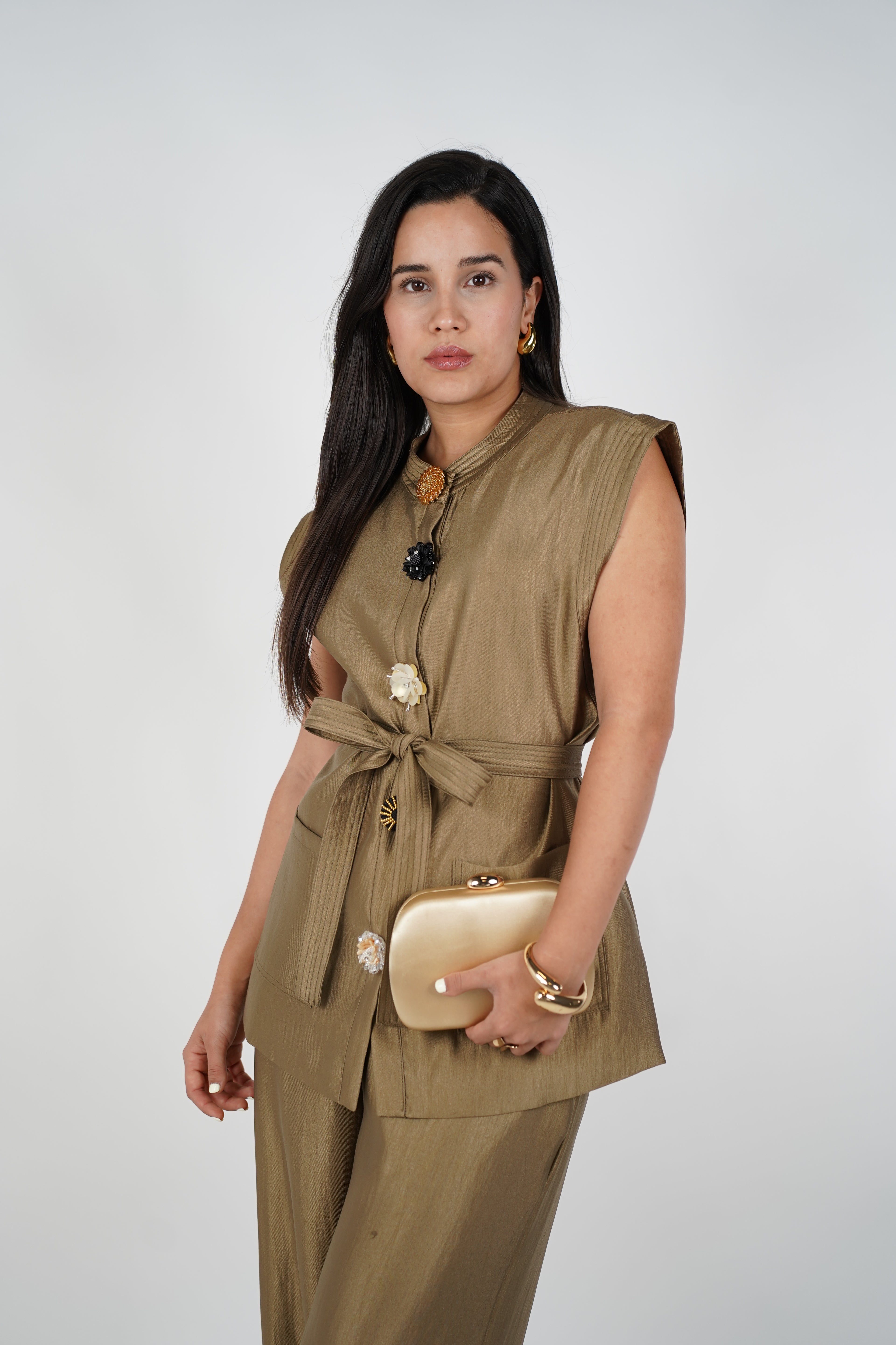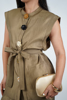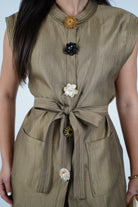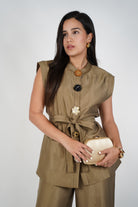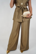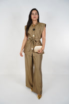 The Zoya Elegant Pants Set is your go-to for elevated sophistication. Featuring a sleeveless structured top with statement oversized flower buttons and a self-tie belt, it perfectly balances modern tailoring and soft feminine details. The matching wide-leg pants drape fluidly with a gentle sheen that moves gracefully with you. This golden-olive hue offers a luxe neutral perfect for everything from professional events to evening gatherings. Style it with gold heels and bold accessories to complete the look.