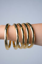 Polished gold-tone stackable bangles designed for timeless elegance and everyday luxury styling.