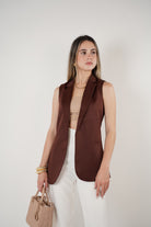 Meta Description: Shop the Zyra Vest – a chocolate brown, structured sleeveless blazer perfect for layering. Available in other colors at Carema Boutique.