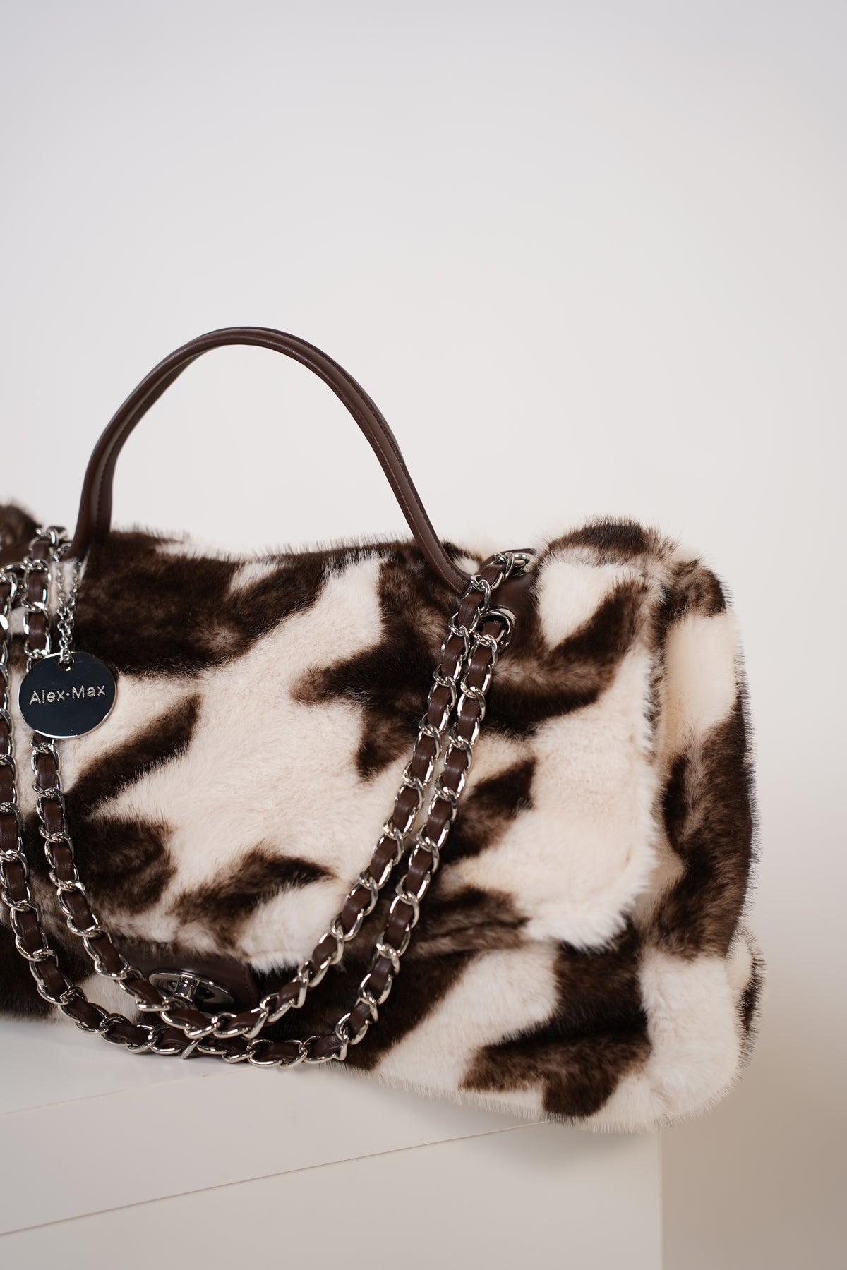 The Cava Tote Bag is your new cold-season statement piece. Featuring an ultra-soft faux-fur exterior with a striking brown-and-cream pattern, this tote delivers luxury and personality in one design. The structured top handle and double chain detail add a polished touch, balancing the cozy texture with elevated hardware. Its spacious interior makes it perfect for daily wear, travel, or adding a glamorous edge to any outfit. Stylish, warm-toned, and instantly eye-catching—this tote brings fashion and function together seamlessly.