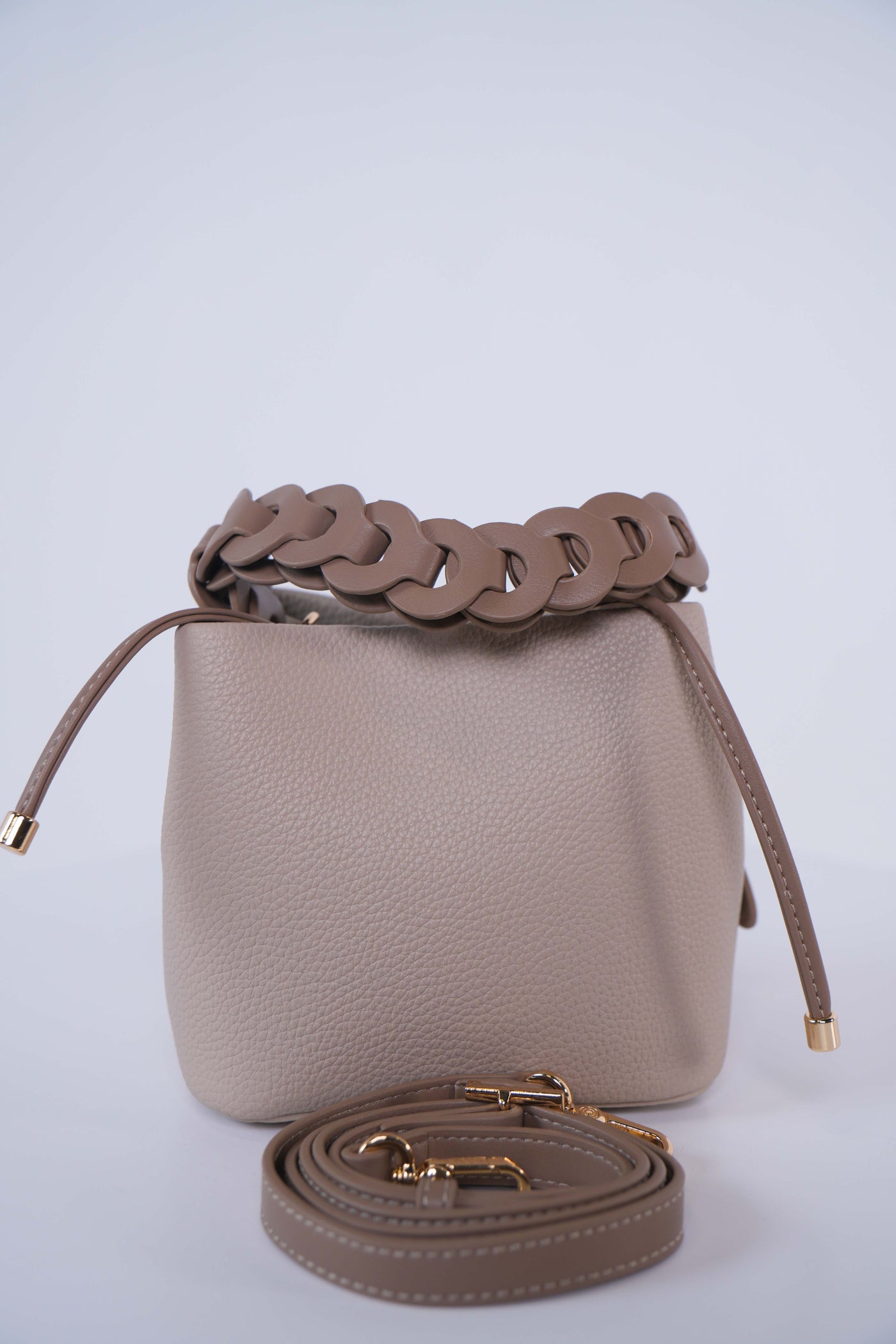 Structured mini bucket bag with chunky chain-style handle. Available in multiple colors for a standout everyday accessory.