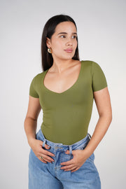 Olive green V-neck short-sleeve bodysuit worn by model.