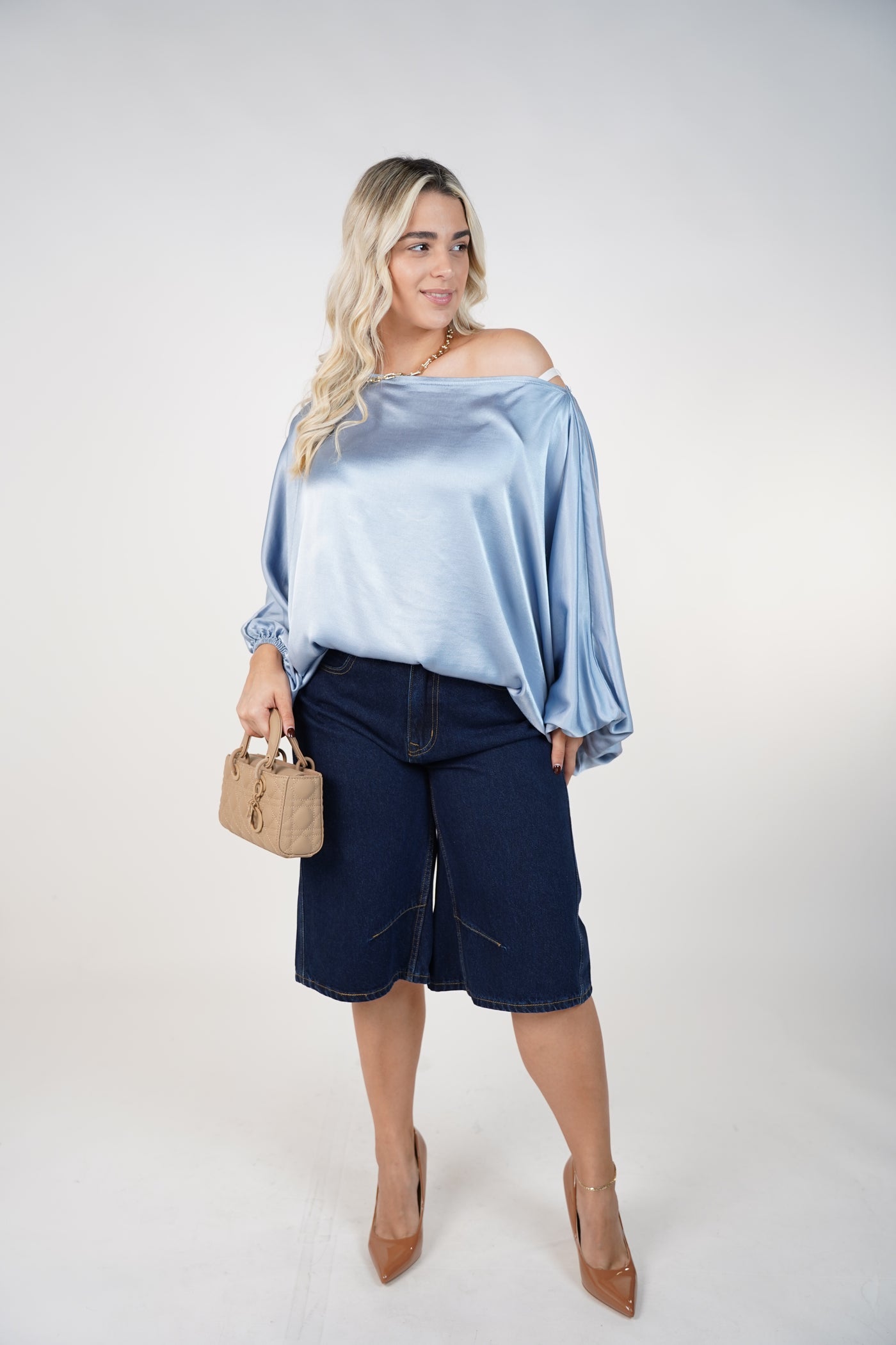 Woman wearing dark denim bermuda shorts styled with a light blue blouse and neutral handbag
