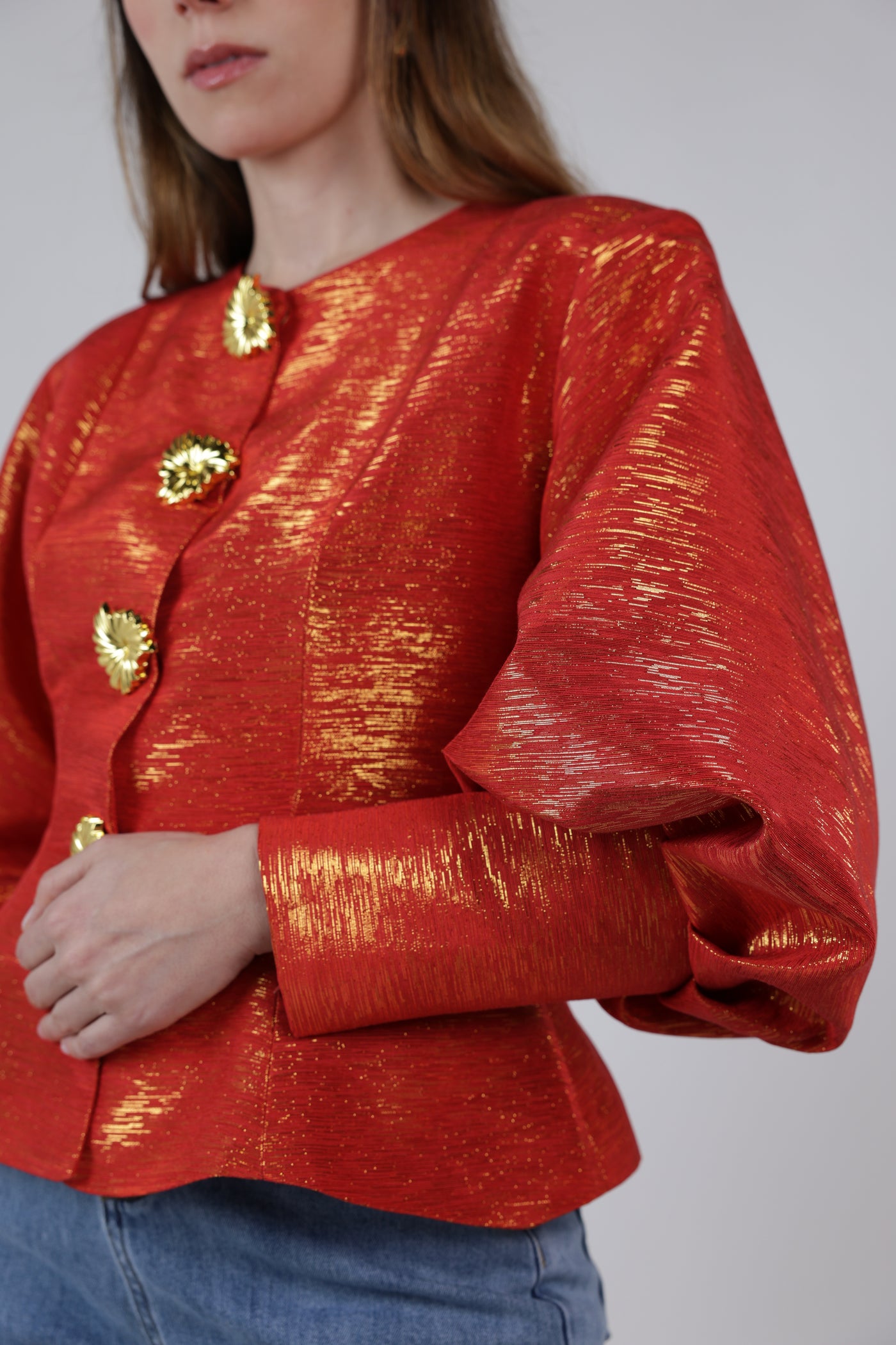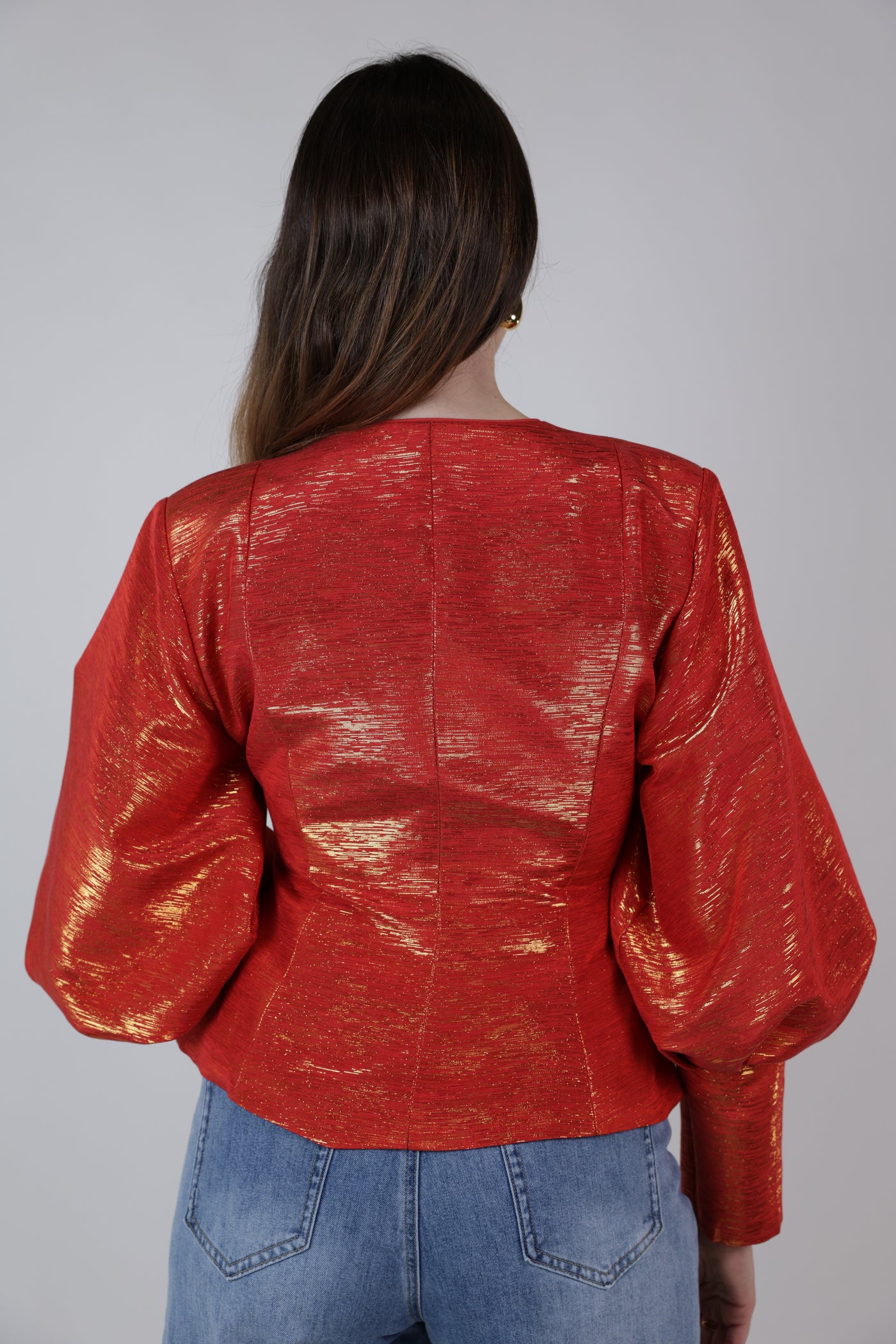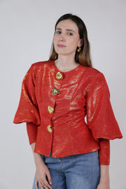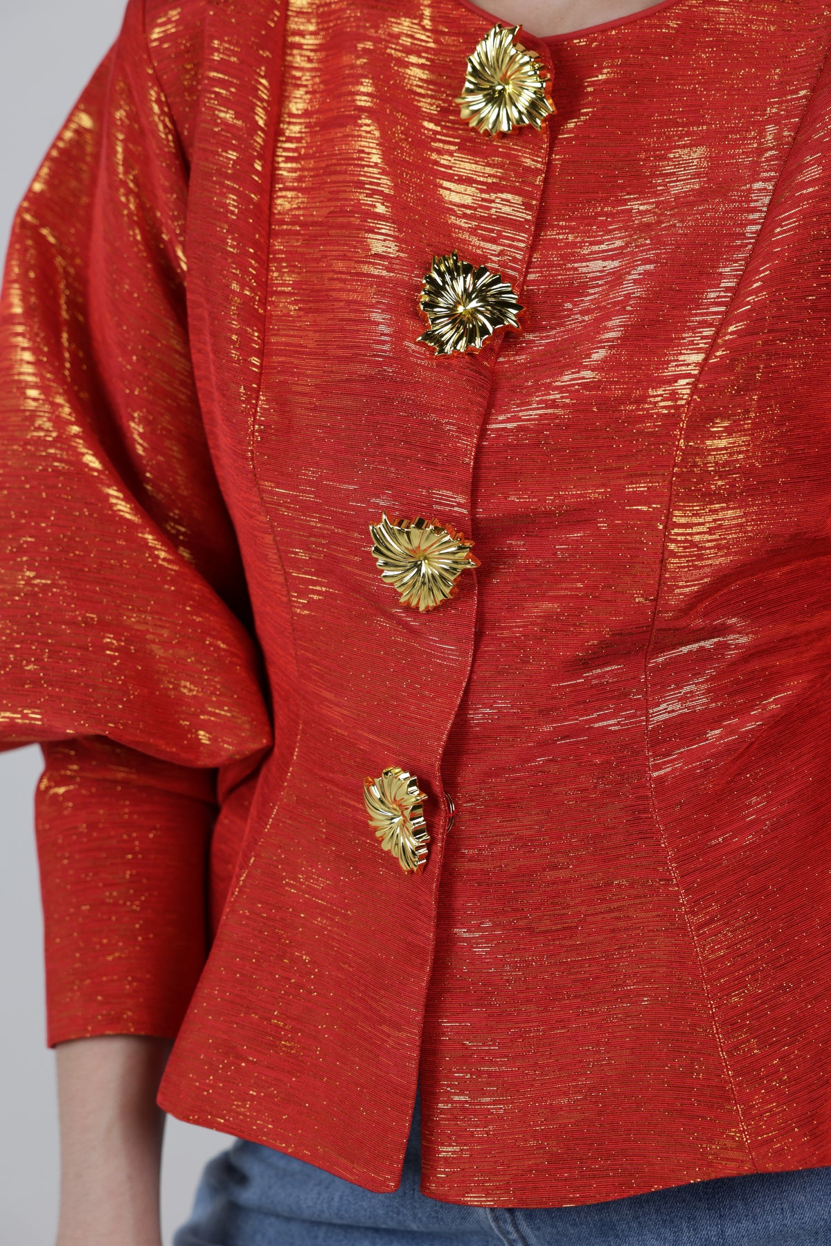 Red metallic puff sleeve structured top with gold statement buttons styled with denim jeans.