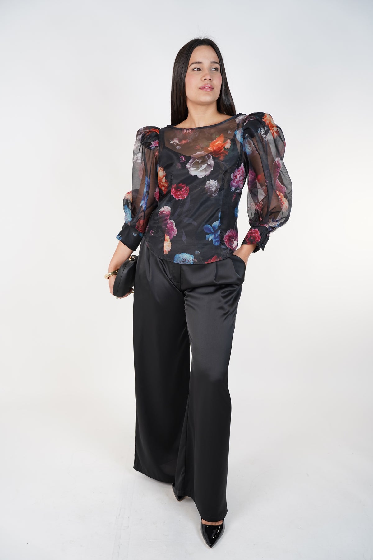 Zorevia Floral Puff Sleeve Top sheer black blouse with colorful floral print and voluminous puff sleeves