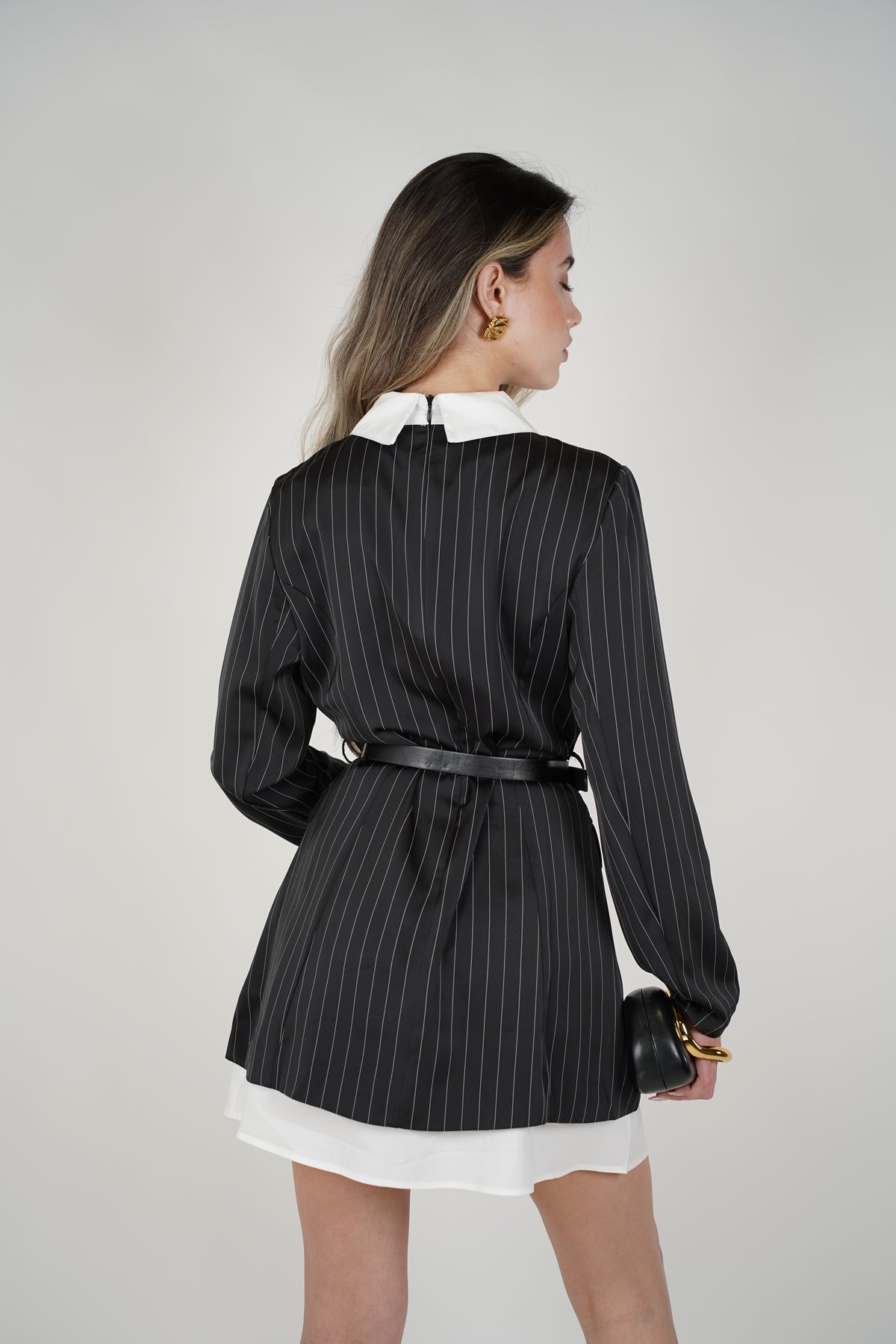 Shop the Averi Striped Mini Dress – black pinstripe blazer-inspired mini with gold details and a white collar. Chic, powerful, and elegant.